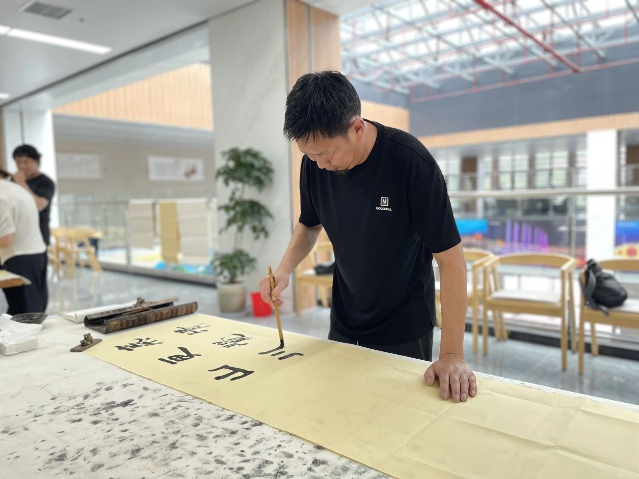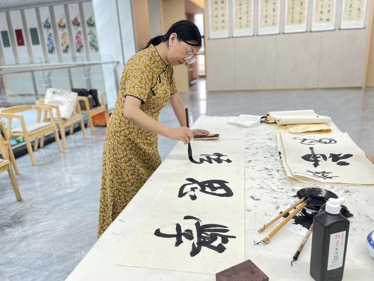 書法家們創作的過程中一起討論交流書法中不同的運筆技巧。他們懷著對書法藝術的崇高敬意和對傳統文化傳承的使命感,沉浸在濃厚的藝術氛圍之中。書法家們以筆會友,互相展示各自的書法作品,分享創作心得和經驗。每一筆、每一劃都蘊含著深厚的功力和獨特的藝術感悟,讓人充分領略到書法藝術的魅力。
